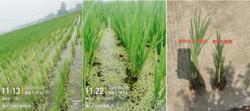 2022年7月10日,江蘇淮安在機(jī)插秧移栽10天后,發(fā)現(xiàn)稻苗生長緩慢,采用10ml碩豐481?+50ml葉面氮肥飛防,10天后進(jìn)行回訪,發(fā)現(xiàn)使用10ml碩豐481?+50ml葉面肥的稻苗白根多、生長旺盛,與附近單撒施尿素田塊相比,使用碩豐481+葉面肥的稻苗株高高35%、分蘗數(shù)多20%、毛細(xì)根多70%。