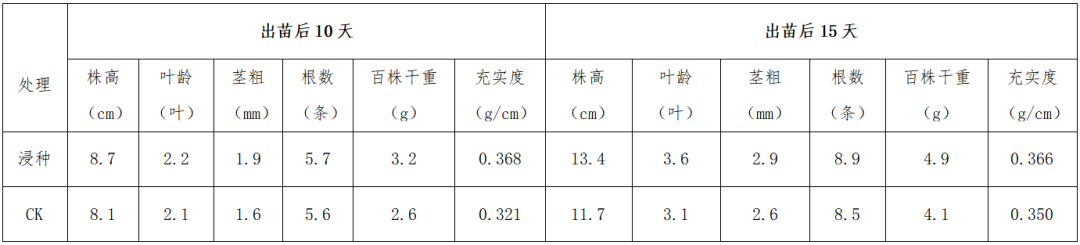 采用天然蕓苔素碩豐481?5000倍對(duì)水稻進(jìn)行浸種育苗,分別在出苗后10天、15天進(jìn)行觀察,結(jié)果發(fā)現(xiàn)浸種處理后幼苗株高、葉齡、莖粗、根數(shù)、百株干重、充實(shí)度分別提高7.40%和12.69%、4.80%和11.54%、18.75%和11.54%、1.79%和4.71%、23.08%和19.51%、14.64%和4.57%。