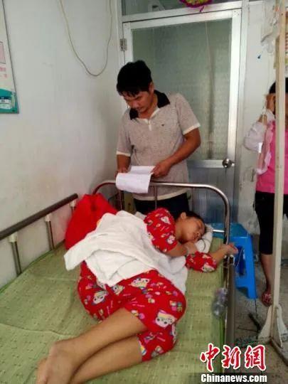 一名學生在醫(yī)院輸液洗胃,家長在旁陪護。