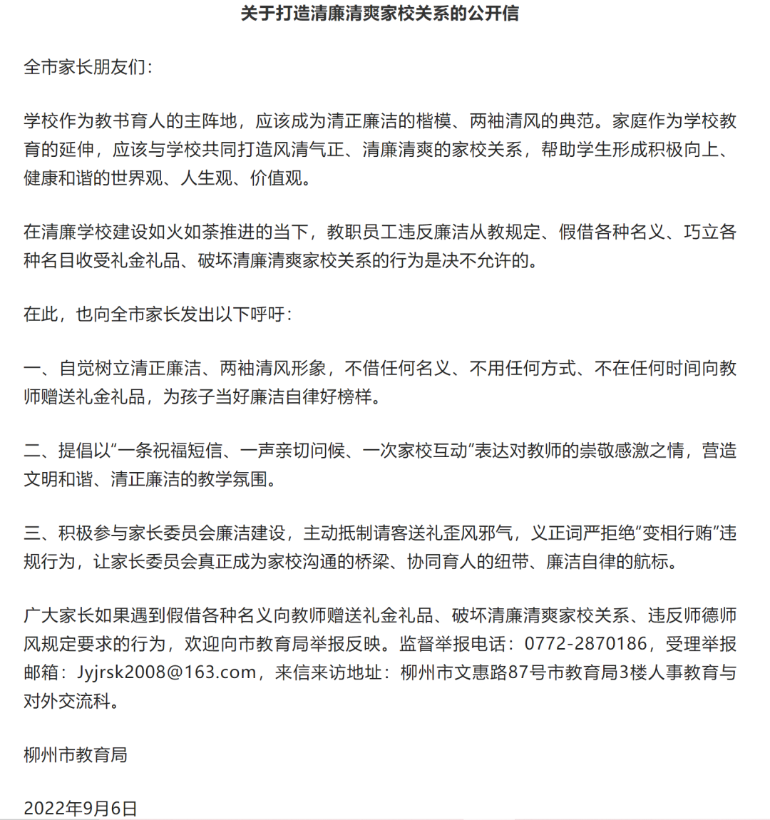 近日,網(wǎng)曝廣西柳州某學校學生家長因反對湊錢送禮給老師,被逼退出家長群,引發(fā)關注。6日,柳州市教育局發(fā)布公開信,呼吁全市家長主動抵制請客送禮歪風邪氣,拒絕“變相行賄”違規(guī)行為。廣大家長如果遇到假借各種名義向教師贈送禮金禮品等行為,可向市教育局舉報反映。(柳州教育局網(wǎng)站、環(huán)球時報)
