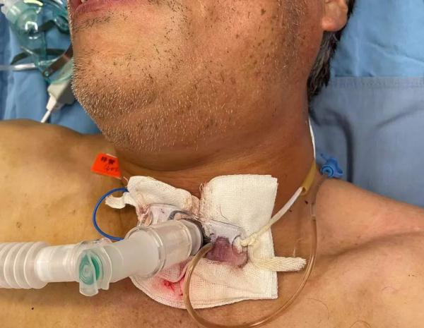 蔣先生被緊急送去手術(shù)室,切開氣管。當時,他的咽喉部和下頜腫脹,上呼吸道被全部壓扁,一絲氣都通不了。要不是綜合性醫(yī)院具備急救能力,蔣先生會被活活憋死。