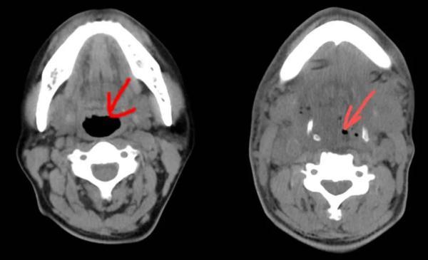 急診CT影像片子里,蔣先生的咽喉、口底、頜下等部位有大量積液和積氣,氣管已被擠得“消失”。