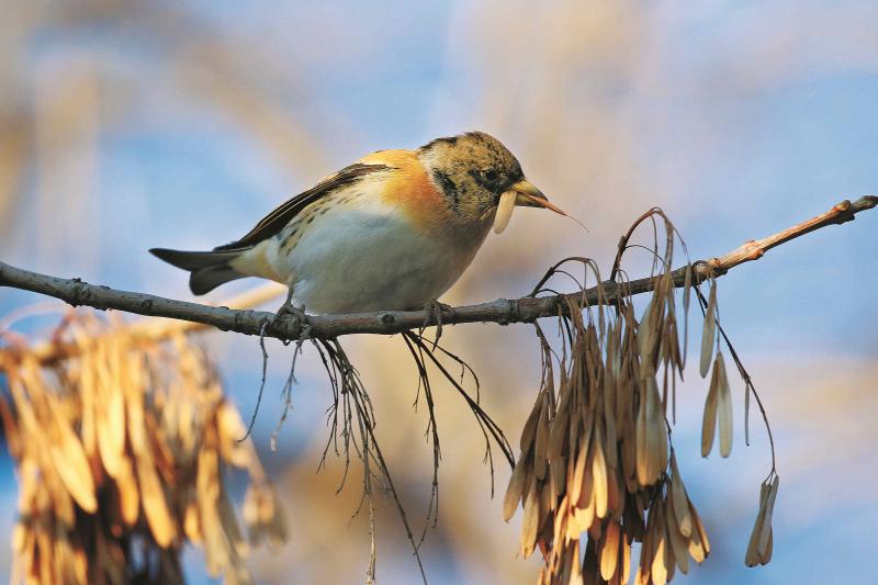 燕雀的喙比較小巧,它們會(huì)先跳到掛著滿滿果實(shí)的枝條上,挑選出一個(gè)果實(shí),然后用輕巧的喙將翅咬斷,再將種子掉個(gè)頭,像嗑瓜子一般將果殼磕開(kāi),把種子取出來(lái)吃掉。而蠟嘴雀和錫嘴雀的喙則相當(dāng)厚實(shí),一口一個(gè),嗑翅果種子的外殼簡(jiǎn)直不費(fèi)吹灰之力。