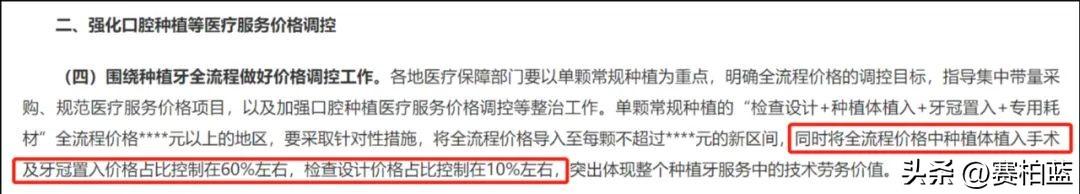 《通知》中明確提出,要將全流程價格中種植體植入手術(shù)及牙冠置入價格占比控制在60%左右,檢查設(shè)計價格占比控制在10%左右。