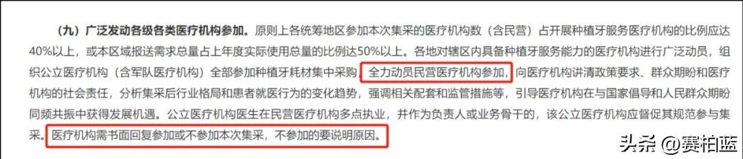 為了推進種植牙集采落地,新《通知》中明確提出,要求各地對轄區(qū)內(nèi)具備種植牙服務(wù)能力的醫(yī)療機構(gòu)進行廣泛動員,組織公立醫(yī)療機構(gòu)全部參加種植牙耗材集中采購,全力動員民營醫(yī)療機構(gòu)參加。醫(yī)療機構(gòu)需書面回復(fù)參加或不參加本次集采,不參加的要說明原因。