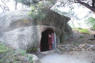 第二處石屋位于與小石廟山頭相鄰的大石廟山頭海拔230米處。山頂立一巨石,呈男根狀,于厚處磨刻一石屋。石屋內(nèi)深3.2米,寬2.65米,面積8.48平方米;石屋右后2米處一巨石上,磨刻兩幅高2米左右鉞形圖案。20世紀(jì)80年代,當(dāng)?shù)厝嗽谑蓍T前蓋一座送子娘娘廟,遮擋了石屋的外部輪廓。