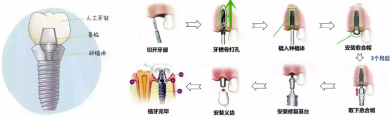 其中種植牙可以理解為先切開牙齦,把牙槽骨打好孔后植入人工種植體充當(dāng)牙根。待幾個月后種植體和牙組織結(jié)合好了,再安裝種植體上面的基臺和牙冠(義齒),也就是實際露出的部分。因為種植牙不需要磨損旁邊的好牙,在牙齦受力性等生理結(jié)構(gòu)上也與真牙接近,所以是能患者生活質(zhì)量的調(diào)節(jié)方式。