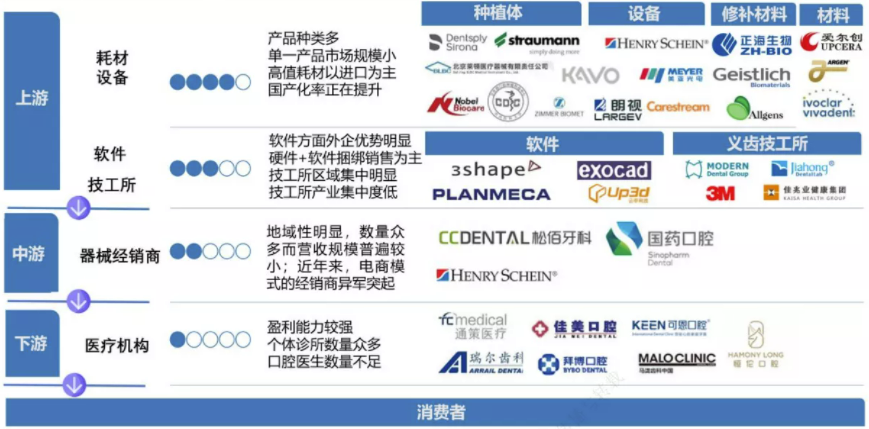 不過種植牙的費用也遠(yuǎn)比前兩者高,這和種植牙行業(yè)上下游的市場格局有直接關(guān)系。