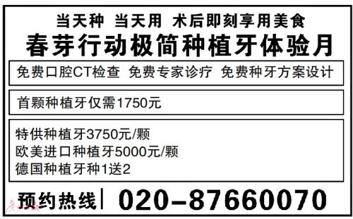 您是否長(zhǎng)期遭受多顆牙缺失的困擾?您是否有在年前種牙的想法,卻有很多顧慮和疑問,或因?yàn)檠啦酃?萎縮、牙周炎等問題難以實(shí)現(xiàn)?春芽行動(dòng)、春芽口腔種植研究所聯(lián)合德國(guó)口腔頜面外科協(xié)會(huì),年前將集中為前牙缺失、后牙缺失、多顆牙缺失、半口無牙甚至全口無牙患者一對(duì)一制定德國(guó)領(lǐng)先的數(shù)字化種牙方案。市民預(yù)約種牙免口腔CT檢查費(fèi)、專家會(huì)診費(fèi)。極簡(jiǎn)種植牙“迎春至簡(jiǎn)價(jià)”體驗(yàn)月,首顆種植牙1750元(含基臺(tái)、牙冠),更多優(yōu)惠種牙資訊可撥打熱線020-87660070垂詢。