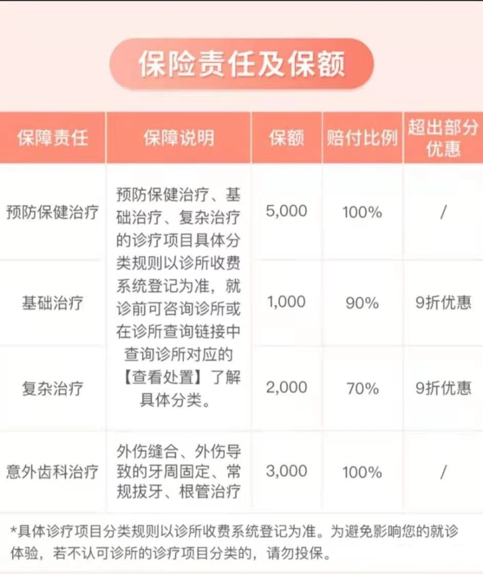 預防保健 比如日常的洗牙,涂氟,窩溝封閉等,保額5000元,賠付,就是說年度花費5000元以內(nèi)的會全部報銷。基礎調(diào)節(jié) 有基礎牙周調(diào)節(jié),常規(guī)拔牙、簡單乳牙根管調(diào)節(jié)、簡單樹脂填充、常規(guī)牙科檢查(包括牙科物理檢查以及X光全景片)。保額1000元,90%賠付,超過部分可以有9折的優(yōu)惠。 注:這一項有7天的等待期,也就是說投保成功7天后才可使用。復雜調(diào)節(jié) 比如根管調(diào)節(jié)、正畸、美白,種植牙、復雜拔牙之類的,保額2000元,70%賠付,超過部分可以有9折的優(yōu)惠。 注:這一項也有7天的等待期,也就是說投保成功7天后才可使用。意外齒科調(diào)節(jié) 比如意外導致的牙齒受損,外傷清創(chuàng),縫合消炎等,保額3000元,賠付。目前市面上價格,以北京為例,補牙基本在250左右/每顆,窩溝封閉也在150左右/每顆,一年588元的保費,光是去做一趟窩溝封閉都足以回本了