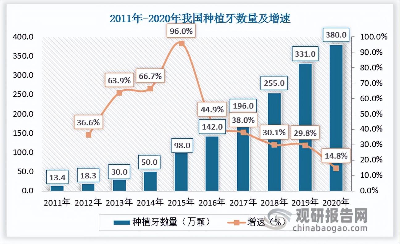 數(shù)據(jù)顯示,2011年-2020年我國(guó)種植牙數(shù)量由13.4萬(wàn)顆達(dá)到380.0萬(wàn)顆,2020年市場(chǎng)規(guī)模達(dá)240億元,占口腔市場(chǎng)的25%。