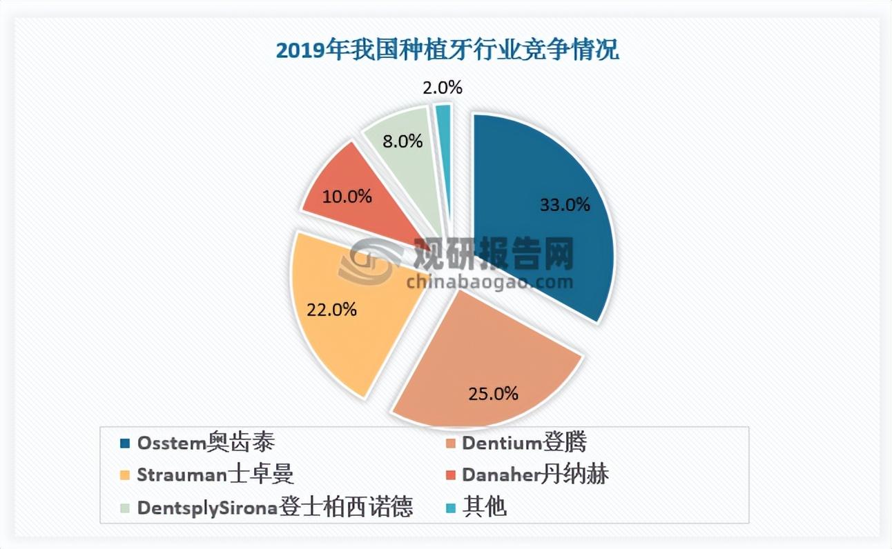 從市場(chǎng)競(jìng)爭(zhēng)方面來(lái)看,國(guó)產(chǎn)種植體由于起步晚,雖然近年來(lái)在表面處理工藝和產(chǎn)品加工精密度方面已經(jīng)逐步成熟,但在臨床數(shù)據(jù)支撐和學(xué)術(shù)支持上有所欠缺,因此國(guó)內(nèi)種植體市場(chǎng)仍以外資品牌占據(jù)主導(dǎo)地位。據(jù)數(shù)據(jù),2019年韓國(guó)Osstem奧齒泰占據(jù)我國(guó)種植牙33%的市場(chǎng)份額;第二為Dentium登騰,市占率為25%。市占率第三的為瑞士品牌Strauman士卓曼22%,第四為美國(guó)丹納赫Danaher(收購(gòu)Nobel)10%;第五為DentsplySirona登士柏西諾德8%。我國(guó)種植牙主要市場(chǎng)被外資品牌所瓜分,未來(lái)隨著國(guó)內(nèi)多省落地種植體集采,種植牙手術(shù)的整體收費(fèi)有望進(jìn)一步下降,將驅(qū)動(dòng)國(guó)產(chǎn)品牌滲透率加速提升。