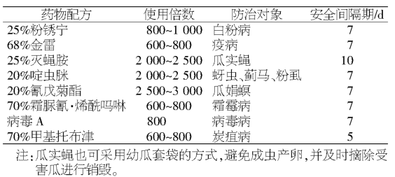 苦 瓜 主 要 病 蟲害有 白 粉 病 、 疫 病 、 霜 霉 病 、 瓜 實 蠅、 瓜 娟螟 、 蚜 蟲 等, 要 以 預(yù) 防 為 主 , 綜 合 治 理 , 綠 色 防 控 。 實 行3 年以 上 輪 作, 加 強 栽 培 管 理 , 深 溝 寬 畦 , 合 理 密 植 , 及 時 整 枝 打葉, 改 善 通 風(fēng) 透 光 條 件 , 使 植 株 生 長 個 士 , 提 高 抗 病 能 力 , 增施 磷 肥 、 鉀 肥, 防 止 過 量 施 用 氮 肥 。 化 學(xué) 防 控 是 目 前 苦 瓜 病 蟲害 主 要 的 防 治 方 法 , 選 用 農(nóng) 藥 及 防 治 對 象 參 見 表1。