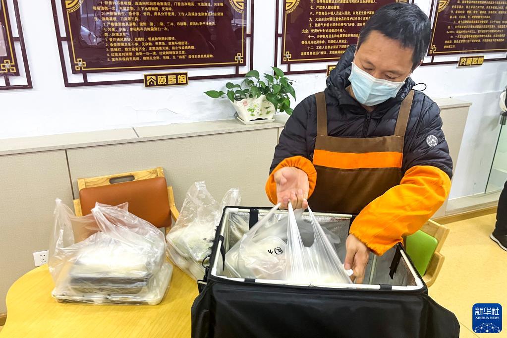 2022年11月3日,吉林省長春市朝陽區(qū)東田社區(qū)助老餐廳的工作人員準備為社區(qū)居民送餐。新華社記者 趙丹丹 攝