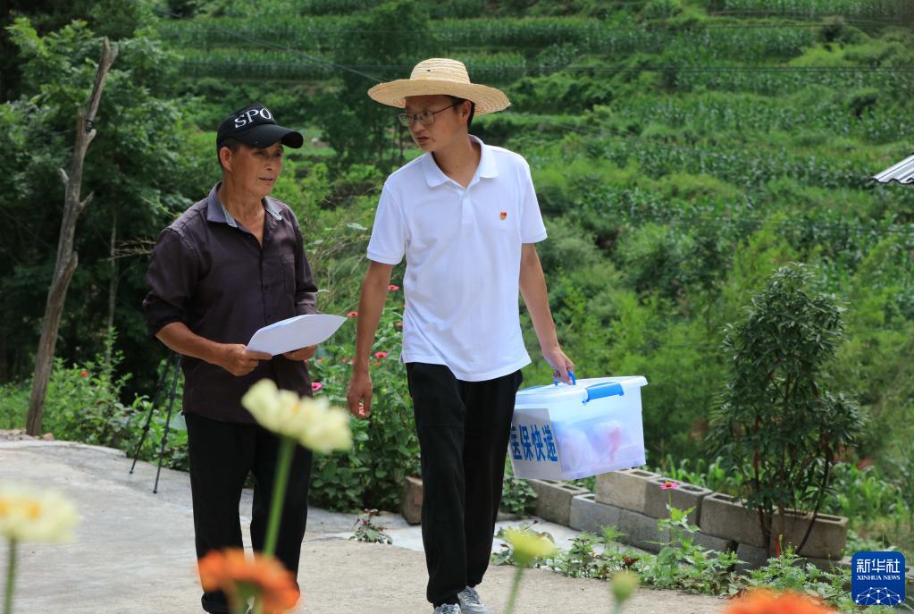 2022年7月5日,湖南省張家界市武陵源區(qū)天子山街道黃河村的“醫(yī)??爝f員”(右)在了解群眾訴求。新華社發(fā)(吳勇兵 攝)