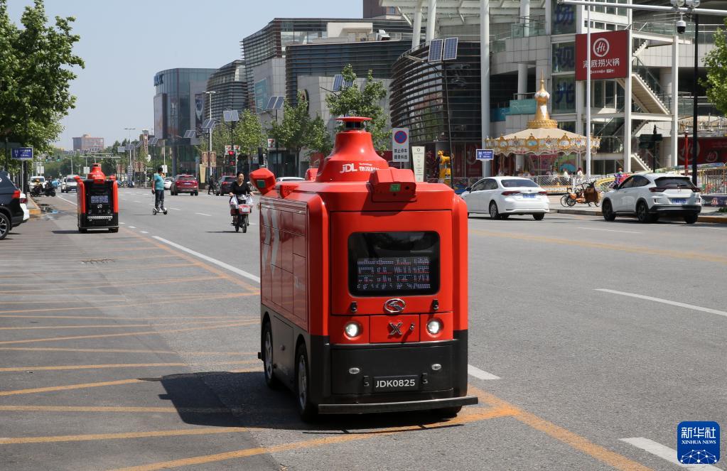 2021年5月18日,一輛自動行駛快遞車在天津(西青)車聯(lián)網(wǎng)先導區(qū)內運送貨物。新華社發(fā)