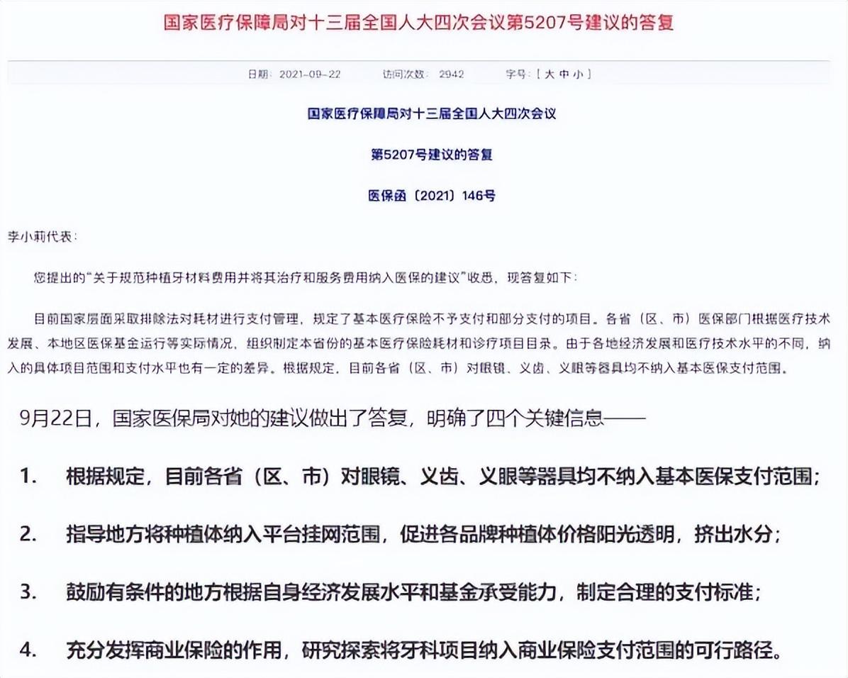 2021年2月兩會期間,人大代表李小莉提交了《關于規(guī)范種植牙材料費用,并將其調(diào)節(jié)和服務費用納入醫(yī)療保險的建議》。
