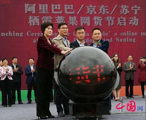 開幕式上科技部農(nóng)村技術(shù)開發(fā)中心副主任、研究院王強同志,山東省科技廳農(nóng)村科技促進中心主任宋玉麗同志共同為“山東棲霞農(nóng)業(yè)科技園區(qū)”揭牌,全國政協(xié)委員、質(zhì)檢總局原副局長、中國檢驗檢疫學會會長魏傳忠同志為棲霞德豐食品、木木農(nóng)業(yè)、伯樂莊園、牙后果蔬和鴻鑫果蔬頒發(fā)“生態(tài)原產(chǎn)地產(chǎn)品保護”證書,“一帶一路”策劃師王冀女士為棲霞“華昕民聯(lián)”牌蘋果(APEC)中國國務(wù)外事國賓禮授牌并為“華昕民聯(lián)”國禮蘋果形象大使楊帆先生頒證;阿里巴巴農(nóng)村淘寶山東大區(qū)總經(jīng)理胡學軍先生、京東生鮮事業(yè)部高級經(jīng)理周冠華先生、蘇寧易購煙臺地區(qū)總經(jīng)理蔣鵬先生和中共棲霞市委書記李寧同志共同啟動阿里巴巴、京東、蘇寧棲霞蘋果網(wǎng)貨節(jié);中共棲霞市委書記李寧同志為分別榮獲棲霞蘋果“銷售大王”和“網(wǎng)絡(luò)銷售大王”的潘德輝先生、王樂將先生頒獎;隨后由農(nóng)業(yè)部原副部長、國務(wù)院參事劉堅同志宣布第十五屆山東棲霞蘋果藝術(shù)節(jié)開幕。