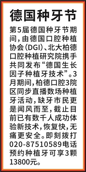 3月,柏德口腔直播德國種植牙技術(shù),不少缺牙市民紛紛來前來咨詢和體驗。4月13日,柏德口腔再次舉辦德國種植牙技術(shù)直播,這是第5屆德國種牙節(jié)后兩場直播,缺牙市民可撥打電話報名參與。4月中旬,柏德口腔將舉辦大型活動,邀請《外來媳婦本地郎》中大佬“阿光”的主演蘇志丹和“蘇貴元”飾演者陳堅雄現(xiàn)場分享他們種植牙的過程。想親臨現(xiàn)場的羊城街坊可以撥打電話報名。