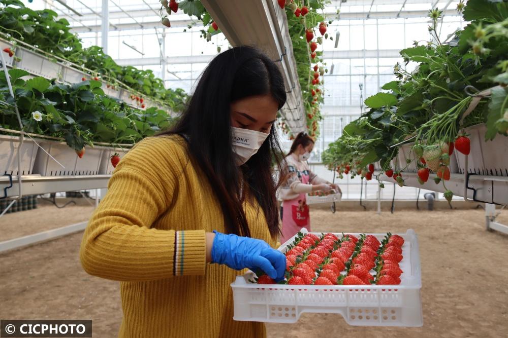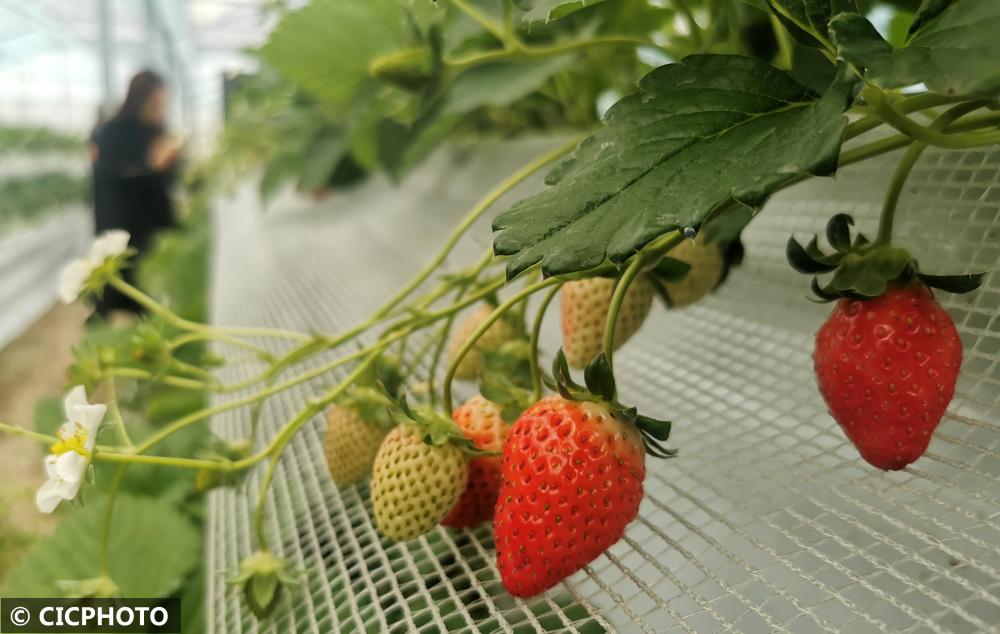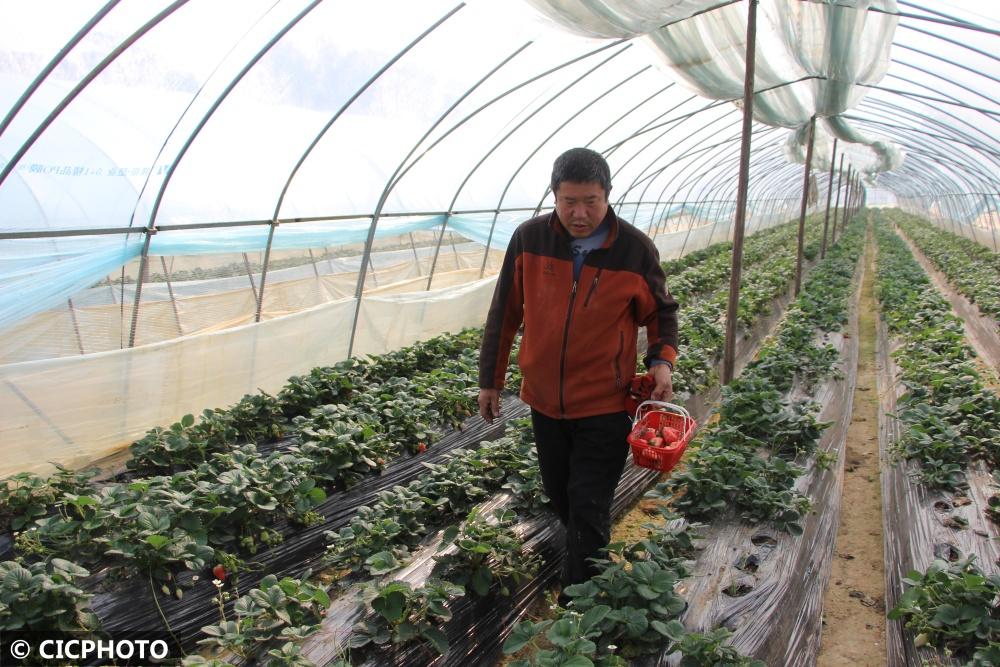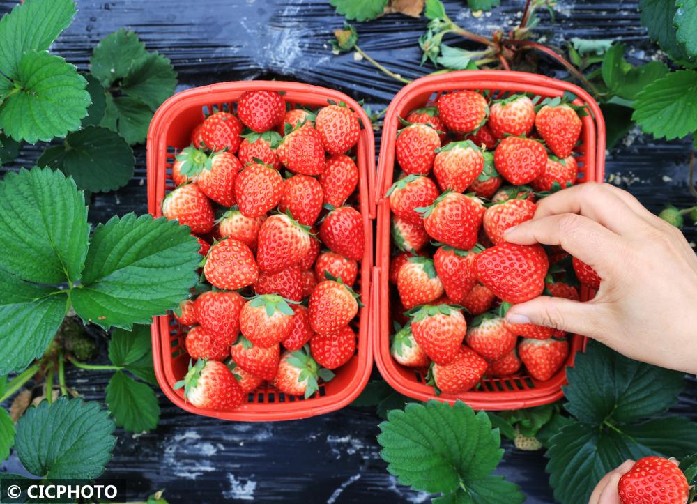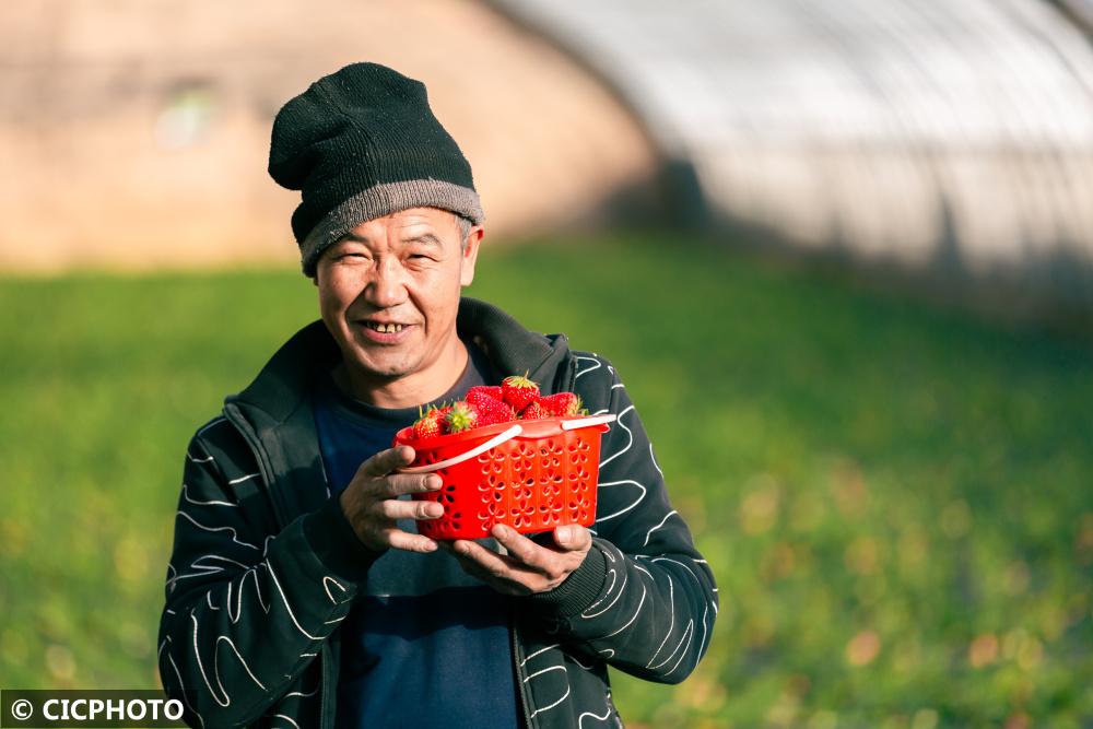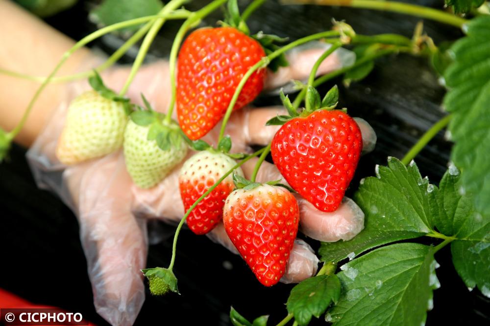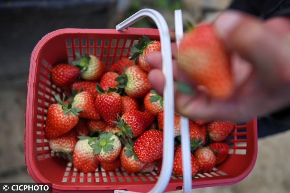 ↑2022年12月7日,山東省聊城市茌平區(qū)樂平鋪鎮(zhèn)小劉新村村民在現(xiàn)代農(nóng)業(yè)產(chǎn)業(yè)示范園內(nèi)采摘草莓。CICPHOTO/馬紅坤 攝