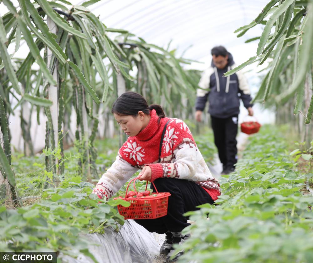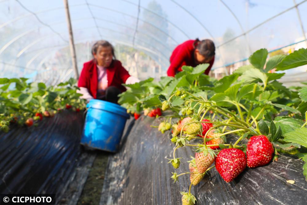↑2022年12月7日,湖南省永州市道縣梅花鎮(zhèn)棠下村村民在大棚里采摘草莓。CICPHOTO/何紅福 攝