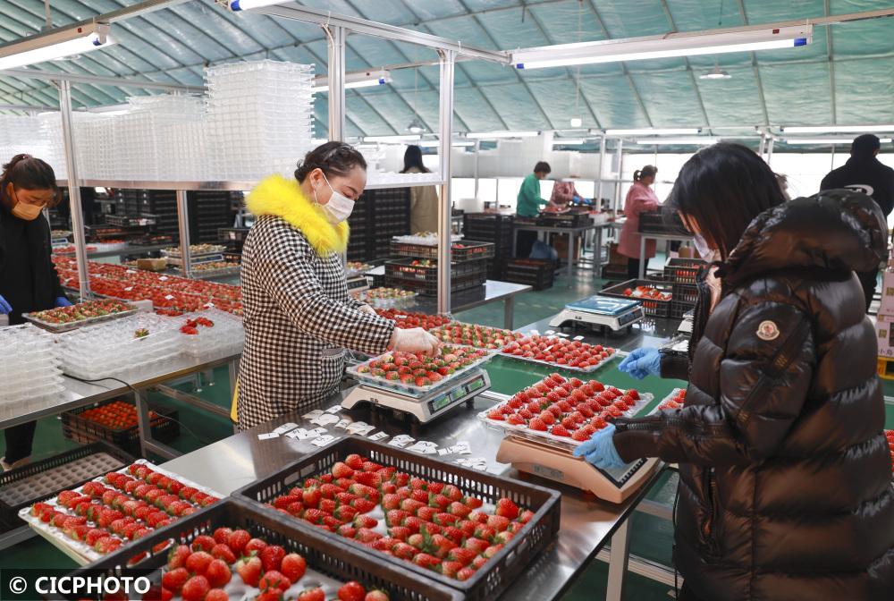 ↑2022年12月11日,江蘇省泰州市姜堰區(qū)蔣垛鎮(zhèn)鹽大村草莓種植基地的員工在分揀剛采摘的草莓。CICPHOTO/顧繼紅 攝