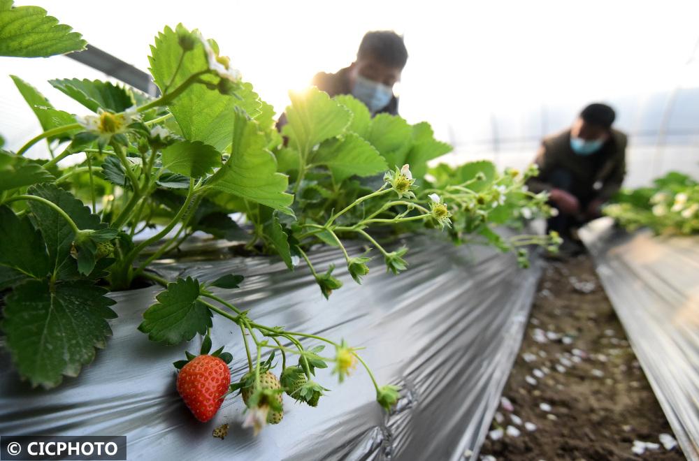 ↑2022年12月7日,河北省邯鄲市叢臺區(qū)黃粱夢鎮(zhèn)貴龍崗村村民在大棚內(nèi)管護(hù)草莓。CICPHOTO/郝群英 攝