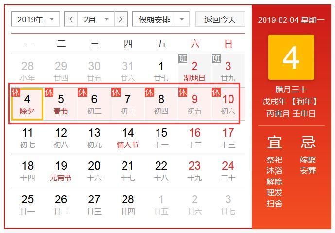 2019年春節(jié)是2月5日(星期二),根據(jù)規(guī)定春節(jié)法定放假時(shí)間是初一到初六,調(diào)休7天。