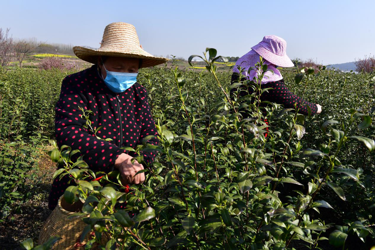 佩戴著草帽和口罩,身上背著一只竹篾簍,手上則是飛快地提采嫩芽........上午9時許,記者在行家山標(biāo)準(zhǔn)化無公害茶園看到,茶枝上的新芽色澤嫩綠,輕輕提采小葉則鮮嫩欲滴;茶園里20多名采茶工人正專心致志地忙著采摘新鮮嫩茶尖。今年,采摘新茶的工人除了必須持有健康證明外,她們還必須在佩戴口罩和測量體溫后方能進(jìn)入茶園,采摘時還要間隔1.2米。