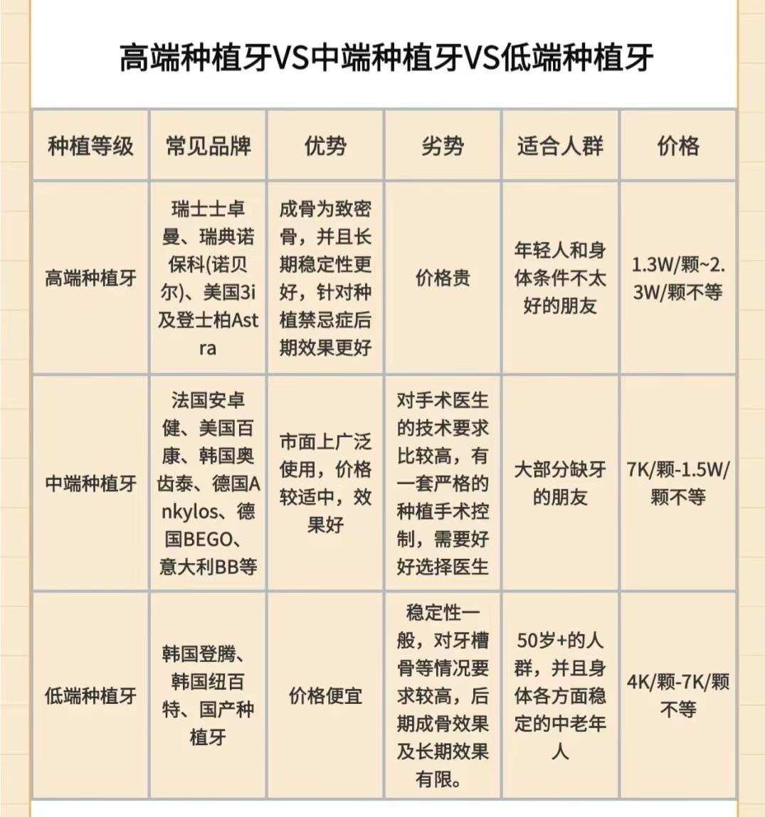 下面兩張圖總結下低中高端種植牙在品牌和價格方面的區(qū)別(價格圖片是我面診其中的一家公立醫(yī)院的價目表,不同醫(yī)院價格可能不一樣,這張只供參考)