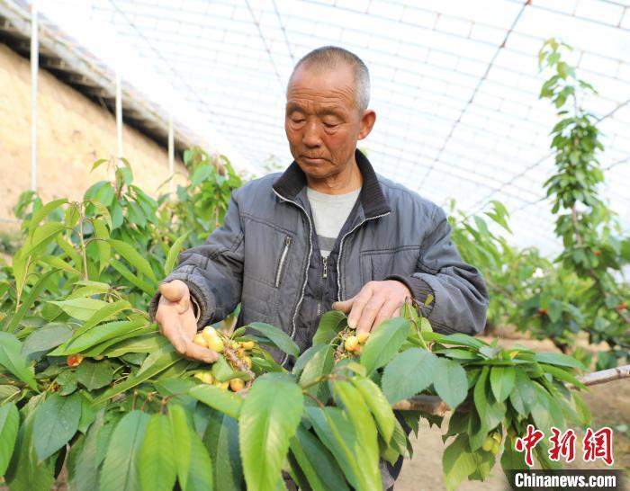 中新網(wǎng)廊坊3月29日電 (宋敏濤 馬珉路)29日,在河北省固安縣渠溝鎮(zhèn)周家務村儂人農業(yè)園櫻桃大棚內,已進入成熟期的櫻桃顆顆圓潤晶瑩,60歲的村民崔素蘭正在棚里忙著管護櫻桃。