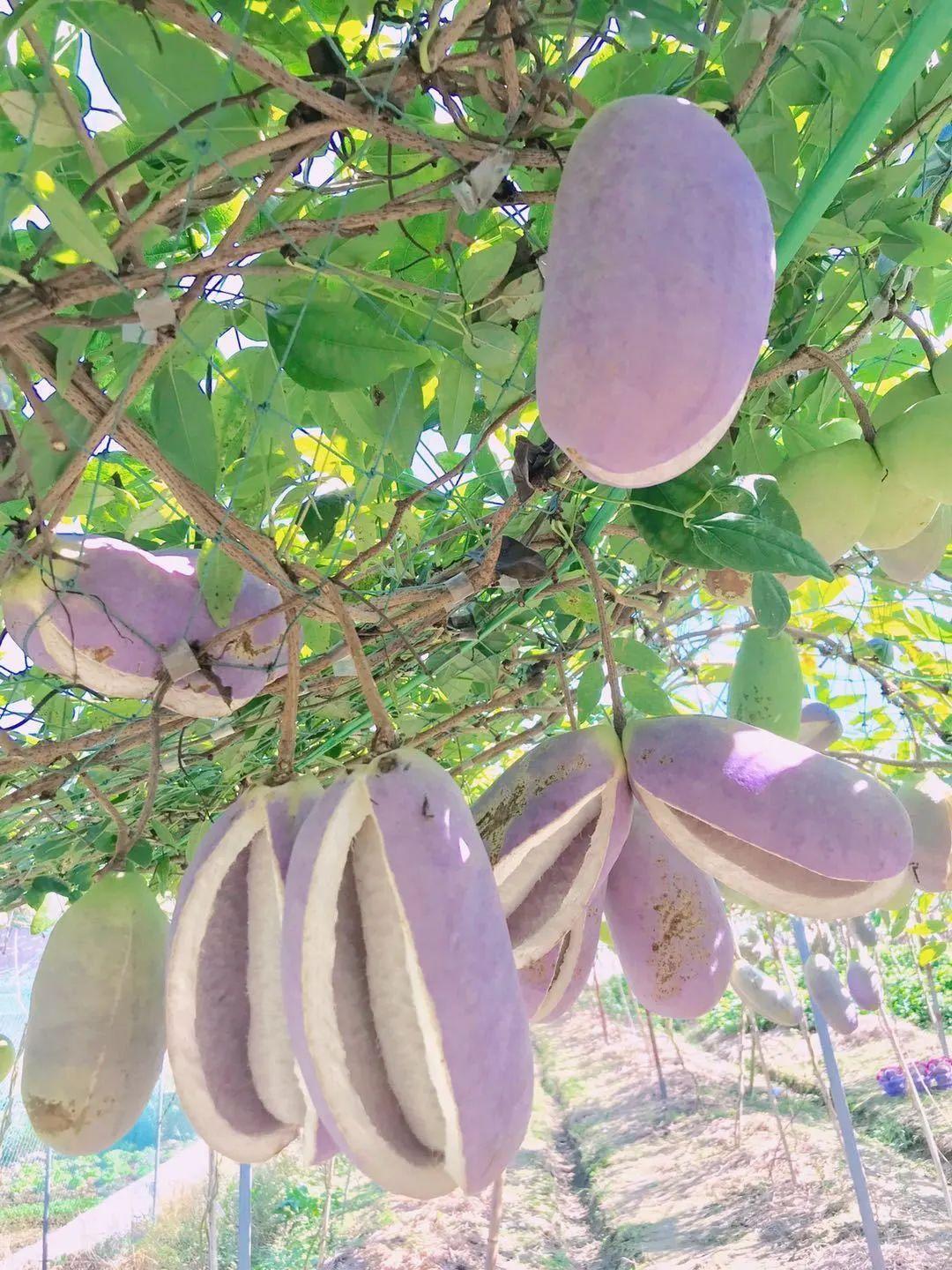 不過也有欣喜的,比如在江西吃到的八月瓜,甜糯的口感,也讓他心心念念地想把它帶回舟山。這種乍看就像大號紫色豆莢的水果,江西、云南、貴州等地都有,在舟山就是稀罕物了。抱著試一試的心情,運苗回舟山種,沒想到這家伙長勢喜人,甚至比在原產(chǎn)地還要長得好,苗子長得粗壯,結(jié)出的果實光鮮亮麗,滋味口感更勝一籌。
