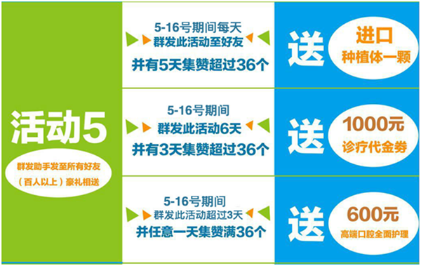 是的,您沒看錯,即日起利用群發(fā)助手將活動圖片發(fā)至百人以上好友,憑截圖至店均有豪禮相送。即日起-16日期間每天群發(fā)活動圖片至好友,每天集贊超過36個,送進口種植體一顆;即日起-16日期間每天群發(fā)此活動,并有3天集贊超過36個,送1000元診療代金券;即日起-16日期間,群發(fā)此活動超過3天,并任意一天集贊滿36個,即送600元高端口腔護理一次。