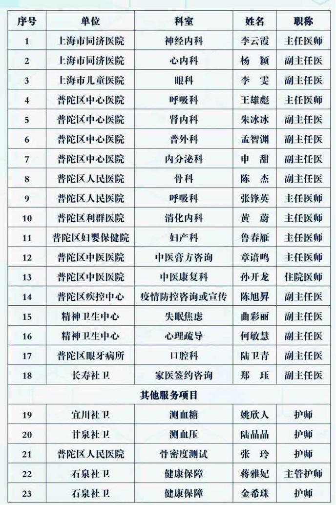當(dāng)天,來自上海市同濟(jì)醫(yī)院、上海市兒童醫(yī)院、普陀區(qū)中心醫(yī)院、普陀區(qū)人民醫(yī)院、普陀區(qū)利群醫(yī)院、普陀區(qū)婦嬰保健院、普陀區(qū)中醫(yī)醫(yī)院、普陀區(qū)疾控中心、精神衛(wèi)生中心、普陀區(qū)眼牙防治所、長壽社衛(wèi)等的“大咖”們將現(xiàn)身坐堂。