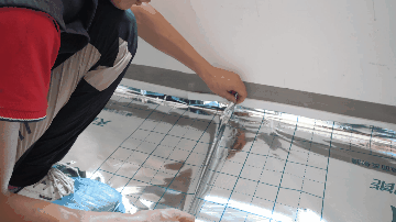 師傅在鋪設(shè)反射膜的時(shí)候很小心,全程穿著鞋套防護(hù),以減少對(duì)反射膜的劃傷,在鋪設(shè)相鄰兩張反射膜時(shí),交叉重疊,而且特別認(rèn)真對(duì)齊了相鄰兩張膜之間標(biāo)注的米格線,這樣在盤管時(shí)才能更準(zhǔn)確的計(jì)算管道間距。只有注意了每個(gè)細(xì)節(jié),才能保障整個(gè)地暖系統(tǒng)散熱均勻,溫度舒適。
