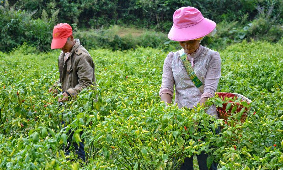 圖為五山鄉(xiāng)中寨村的種植戶在小米辣種植基地采摘小米辣(趙樹龍 攝)