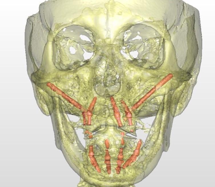 手術當天,江宏兵院長在數(shù)字化外科導板和數(shù)字化導航輔助下,于上頜后牙區(qū)成功植入2枚Nobel穿顴種植體,前牙區(qū)植入3枚NobelParallel CC種植體,并在上頜竇開窗區(qū)及過薄的種植體唇側充填骨粉,覆蓋膠原膜。下頜則在數(shù)字化外科導板引導下,避開患者數(shù)年前充填的美容假體和其他重要解剖結構,植入4枚NobelParallel CC種植體,所有種植體初期穩(wěn)定性均達到35 N?cm,符合負重的要求。