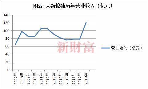 2011年11月,大海糧油投產(chǎn),主產(chǎn)大豆油、棕櫚油和“豐苑”牌豆粕,產(chǎn)品主要銷往廣西、云南、貴州等地,并出口韓國、菲律賓和越南。從2008年開始,大海糧油連續(xù)12年登上“廣西企業(yè)100強(qiáng)”榜單,從2012年開始連續(xù)7年登上“中國對外貿(mào)易500強(qiáng)”榜單。其2018年度營業(yè)收入為120.96億元,較2007年64.71億元營收近乎翻倍(圖2),是金龍魚分享中國食用油產(chǎn)業(yè)迅猛發(fā)展成果的縮影。