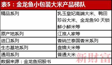 迄今為止,金龍魚在中國水稻生產(chǎn)加工行業(yè)累計(jì)投資超過21億元,水稻年加工規(guī)模達(dá)到270多萬噸。其大米產(chǎn)品品牌包括進(jìn)口泰國香米品牌香納蘭和金龍魚東北大米、蘇北大米、江淮人家、乳玉皇妃等(表5)。