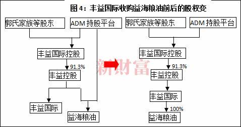 第二步,豐益國際以約16億美元的對價(jià),并購母公司豐益控股的中國業(yè)務(wù),ADM等股東所持益海糧油股權(quán)置換成豐益國際的股權(quán),益海糧油變?yōu)樨S益國際全資子公司,ADM成為豐益國際股東(圖4)。