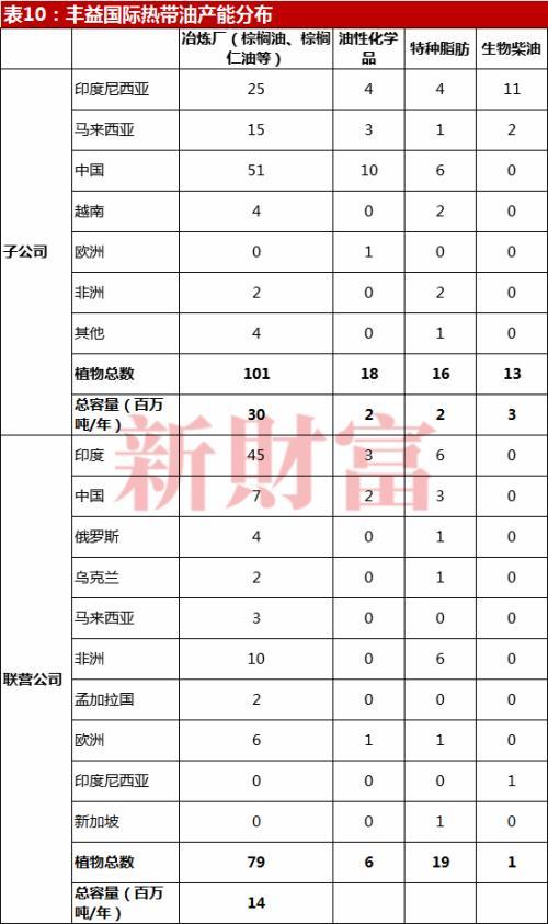 2018年年報(bào)顯示,豐益國際是世界上大的棕櫚油和月桂油加工商,年產(chǎn)棕櫚油3000萬噸,其在全世界擁有全資棕櫚油加工企業(yè)101家,其中中國多,有51家,在印度和印度尼西亞的市場份額分別約為20%和36%;參股聯(lián)營的棕櫚油加工企業(yè)79家,年產(chǎn)棕櫚油1400萬噸(表10)。豐益國際控制著近4400萬公噸的棕櫚油產(chǎn)能,是2008年產(chǎn)能的近15倍。