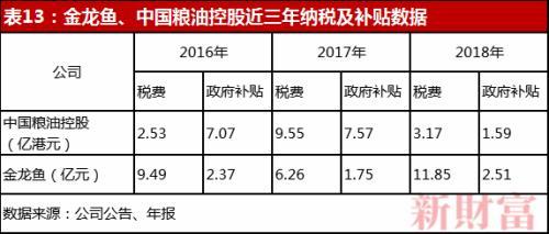 新財(cái)富查詢發(fā)現(xiàn),2016-2018年,承擔(dān)中糧“忠于國計(jì)、良于民生”責(zé)任的中國糧油控股納稅總額雖低于金龍魚,但獲得的政府相關(guān)補(bǔ)貼卻高于金龍魚(表13)。