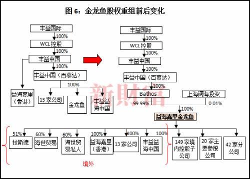 豐益國際通過18家境外投資控股平臺,直接、間接控制著國內(nèi)眾多的業(yè)務(wù)主體。在籌劃上市時(shí),為有整合主營業(yè)務(wù)和資產(chǎn),避免同業(yè)競爭并滿足A股上市相關(guān)要求,金龍魚從2017年7月開始實(shí)施了同一控制下的五大資產(chǎn)重組,豐益國際將其控制的中國境內(nèi)與金龍魚主營業(yè)務(wù)相關(guān)的經(jīng)營實(shí)體逐步注入金龍魚。