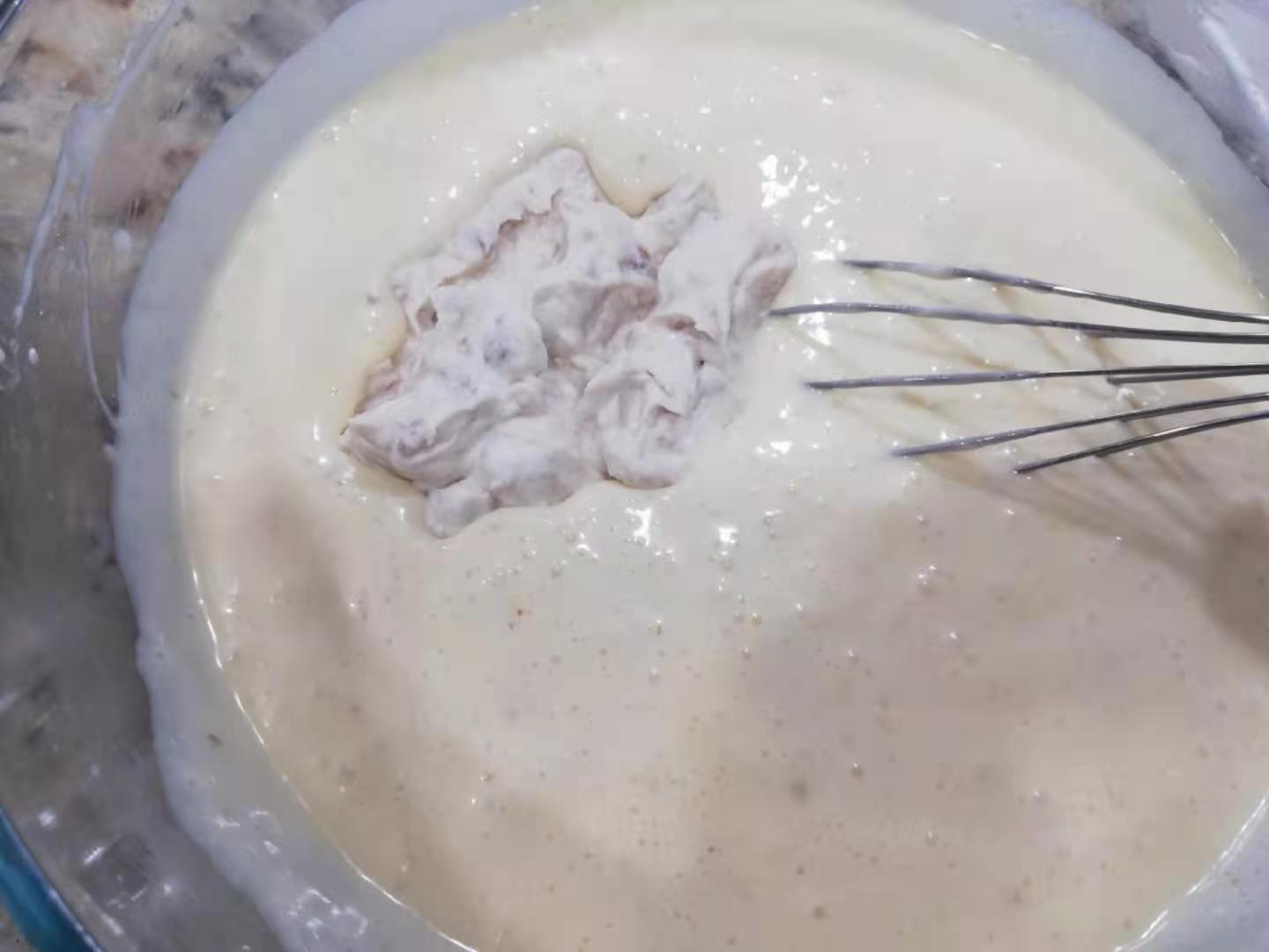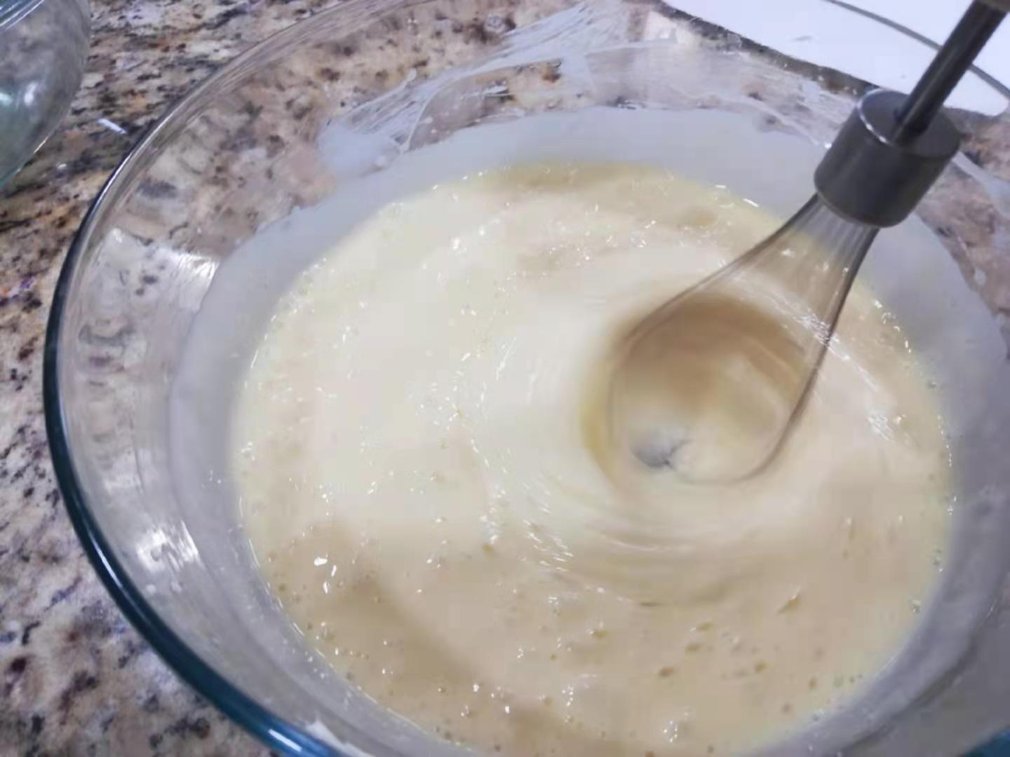 雞蛋液分三次放入,每次都攪打均勻。