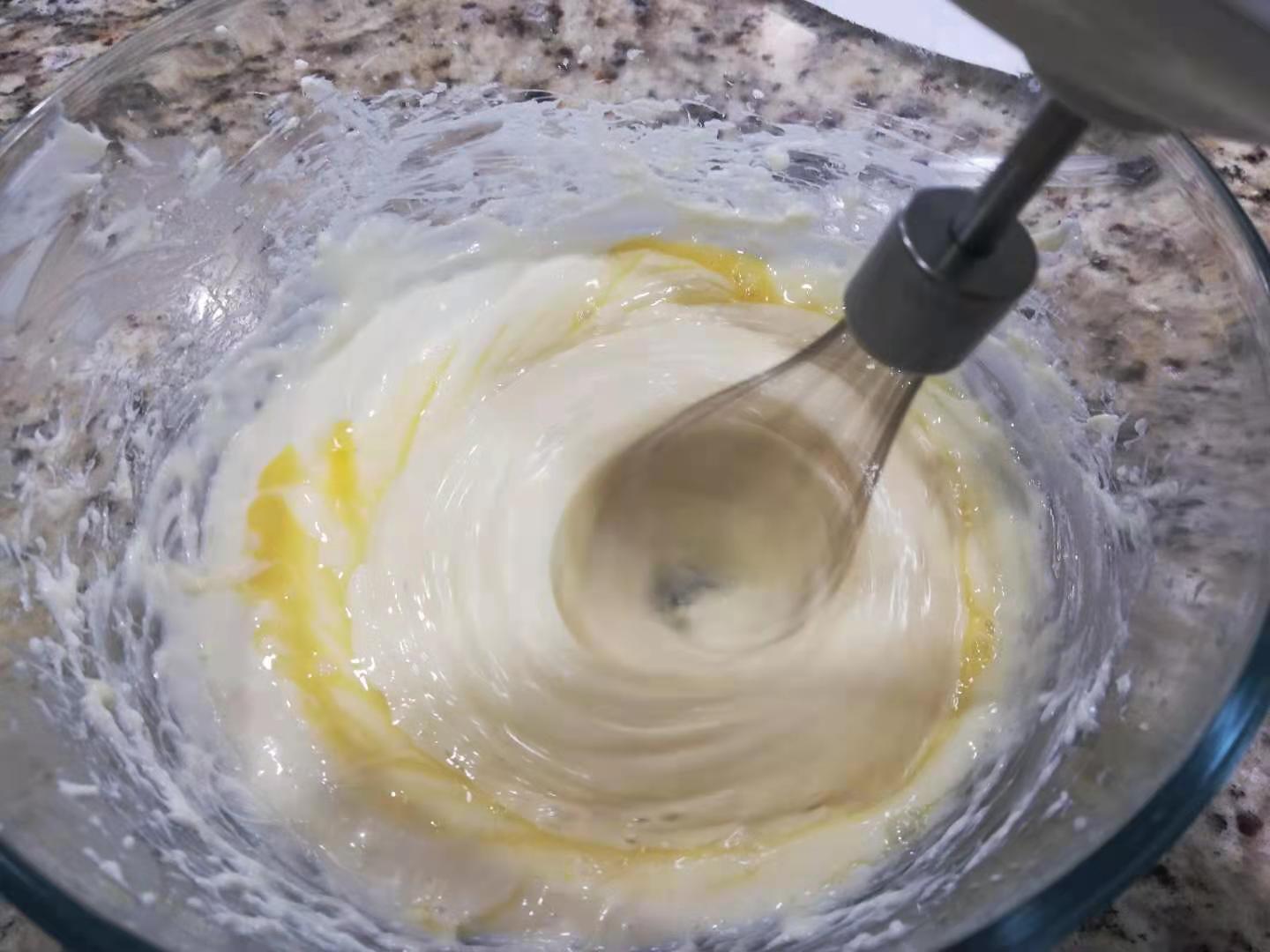 當(dāng)奶油奶酪變得十分順滑,細(xì)砂糖充分溶解,即可停止攪拌。