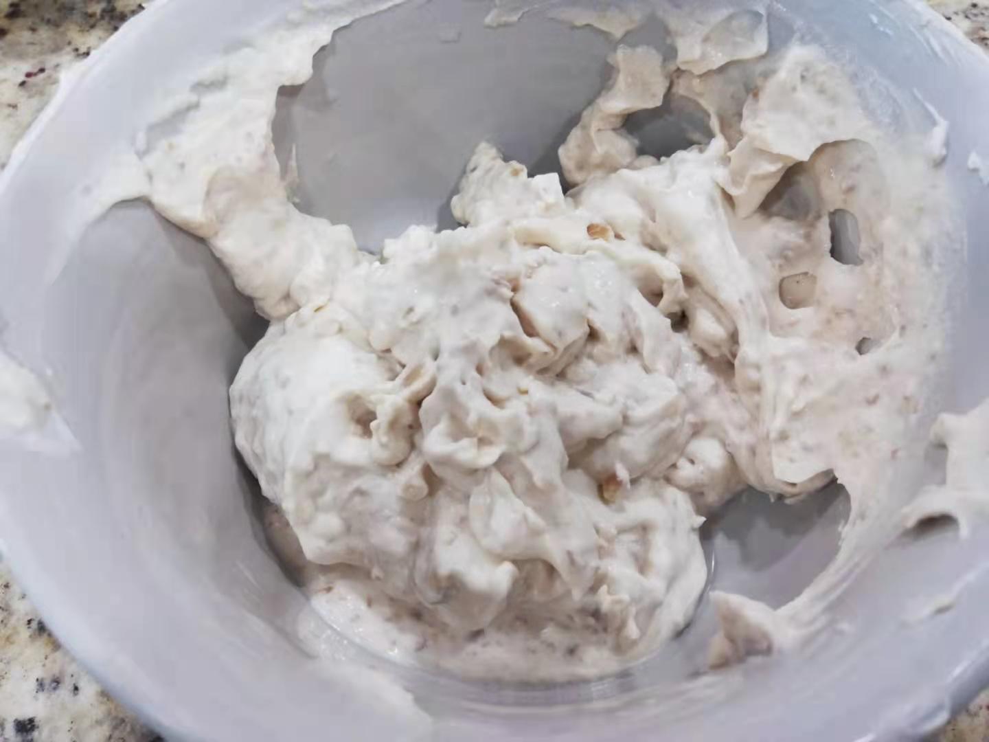 倒入奶油栗子泥和剩下的100克淡奶油(液體),用蛋抽手動(dòng)攪拌均勻成栗子奶酪糊。