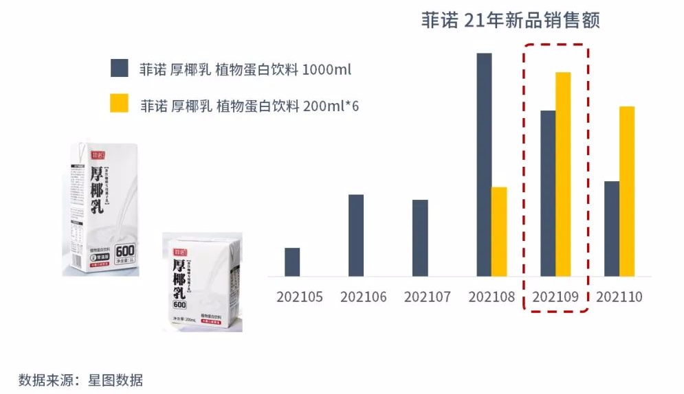 菲諾乘勝追擊,迅速發(fā)起C端的布局,2021年5月份即在天貓、京東上線1L裝厚椰乳單品。為了更好地迎合C端消費(fèi)者的需求,同年8月又推出200ml的小規(guī)格包裝,次月便在銷量上勝過(guò)了1L裝的單品,成為其主力銷售產(chǎn)品。