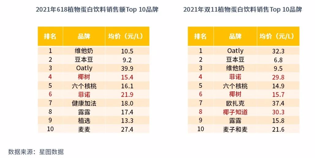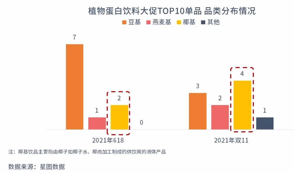 菲諾的快速出圈也再次掀起了椰子類飲品的熱潮。在2021年618,在植物蛋白飲銷售額TOP10單品中,椰基類占2個(gè),而到了雙11,椰基飲品超越豆基飲品,成為上榜多的單品。