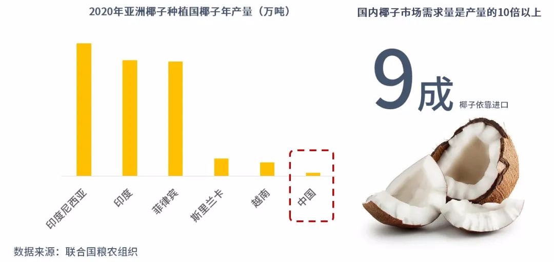 根據(jù)聯(lián)合國(guó)糧農(nóng)組織數(shù)據(jù),中國(guó)椰子種植面積僅占的0.29%,占亞洲的0.32%。僅靠中國(guó)的產(chǎn)量根本無(wú)法滿足龐大的市場(chǎng)需求,因此國(guó)內(nèi)有9成的椰子靠進(jìn)口。受疫情影響,進(jìn)口船期的延長(zhǎng)、長(zhǎng)途運(yùn)輸過(guò)程中椰子的破損率提高,無(wú)形中也推高了企業(yè)的成本。供應(yīng)鏈?zhǔn)撬行吕掀放贫紩?huì)面臨也需攻克的難題。