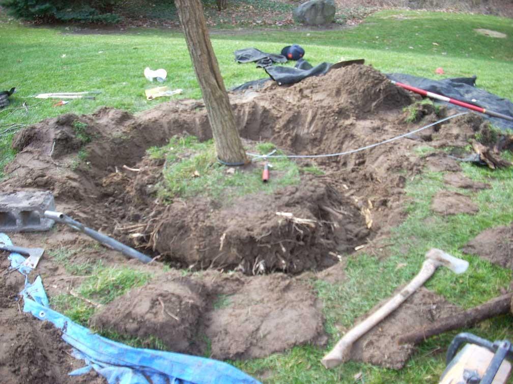 另一種方式是對(duì)付一株較大的樹木,這類樹木可能無法用繩索拉直,就必須使用挖掘的方式。